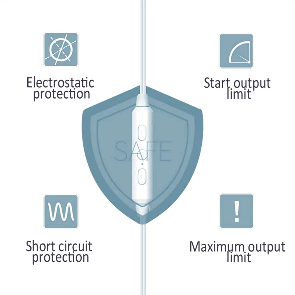 1.This product is a very portable line-controlled massage device, no need to charge and battery, plug in the phone or power supply can be used, easy to operate, three-button control, 6 mode selection, 9-level intensity adjustment.